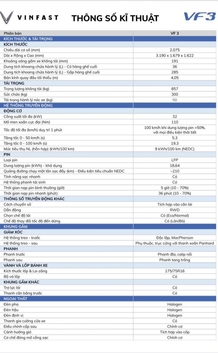 Bảng Thông Số Kỹ Thuật Xe VF3 2025 _ VinFast Hải Phòng